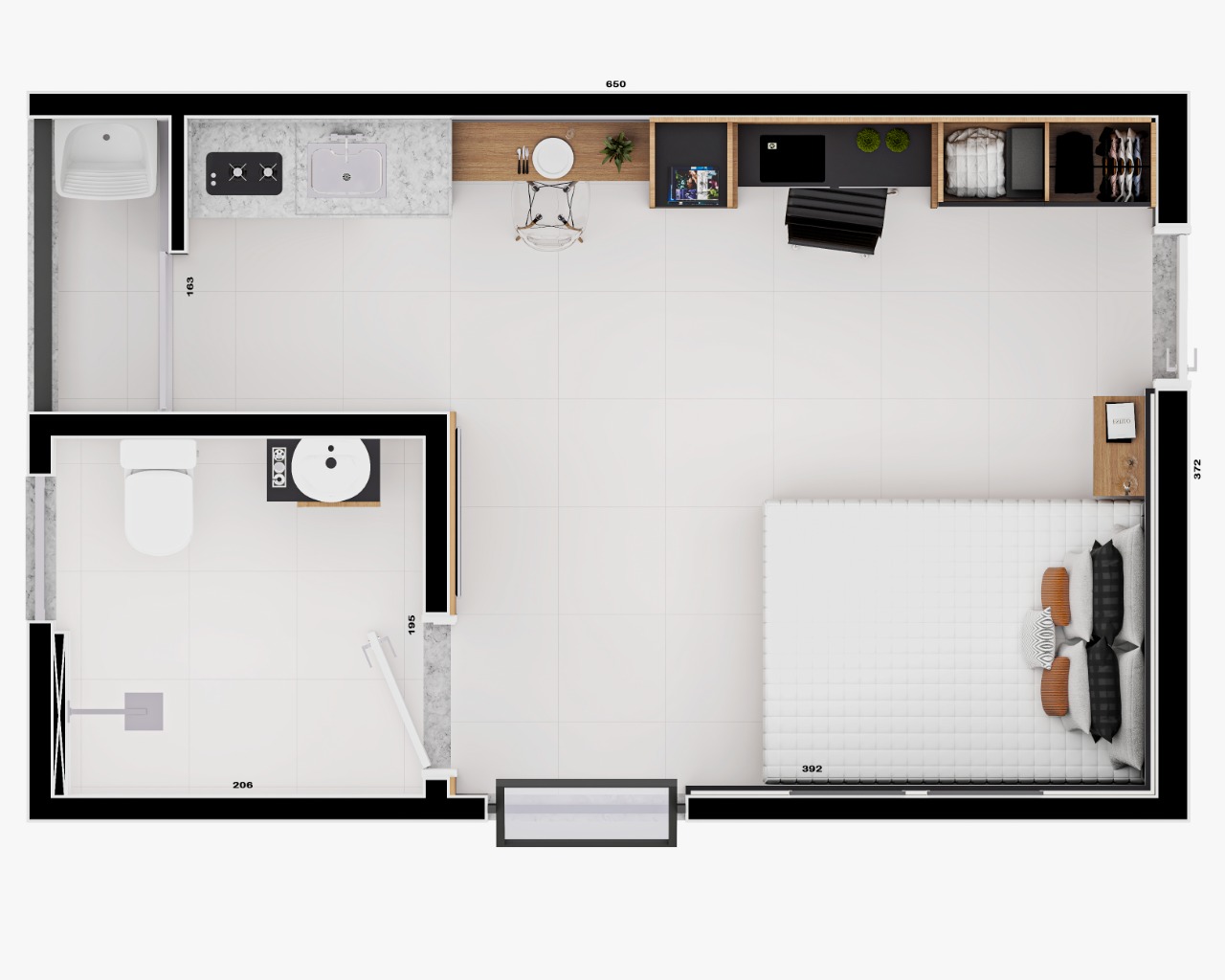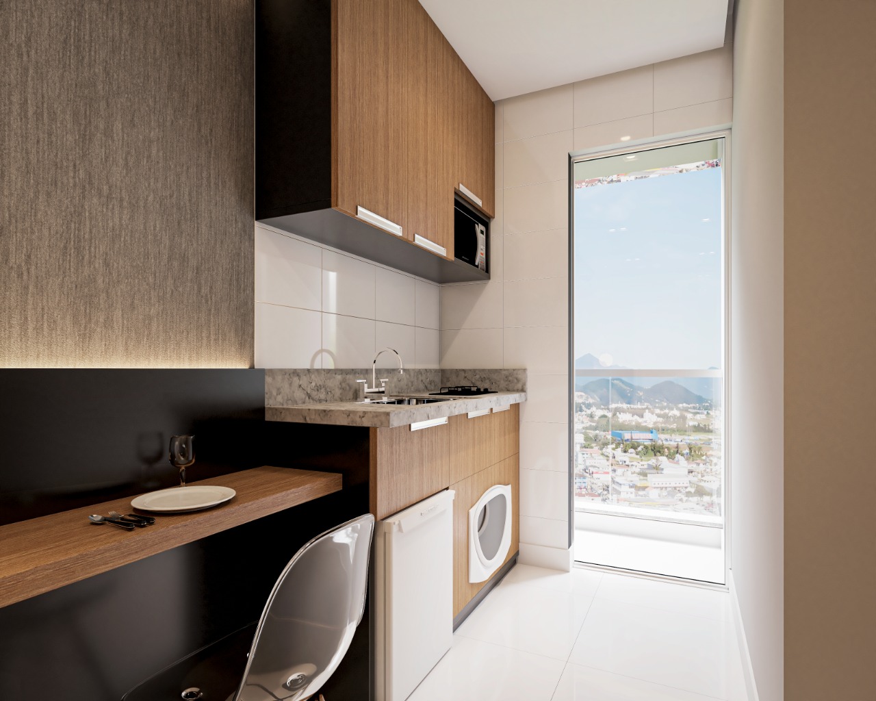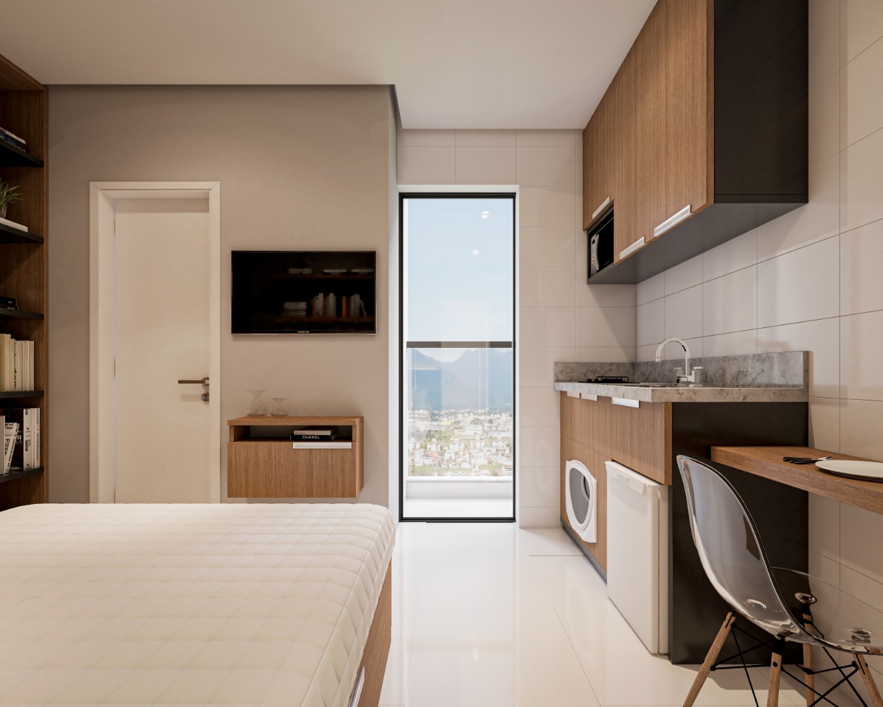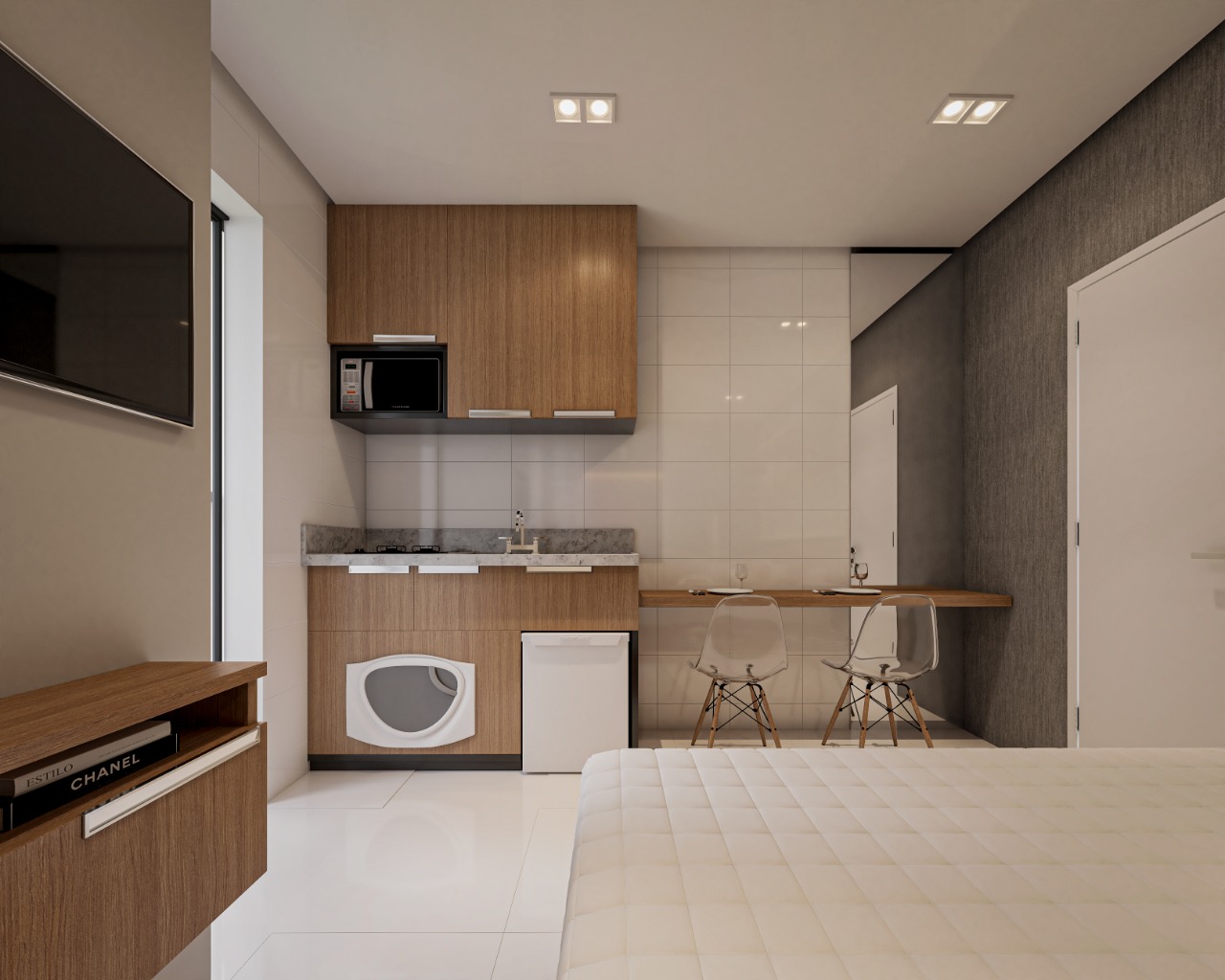 Studio com área construída de 19,11m² com empreendimento contando com lavanderia e academia.