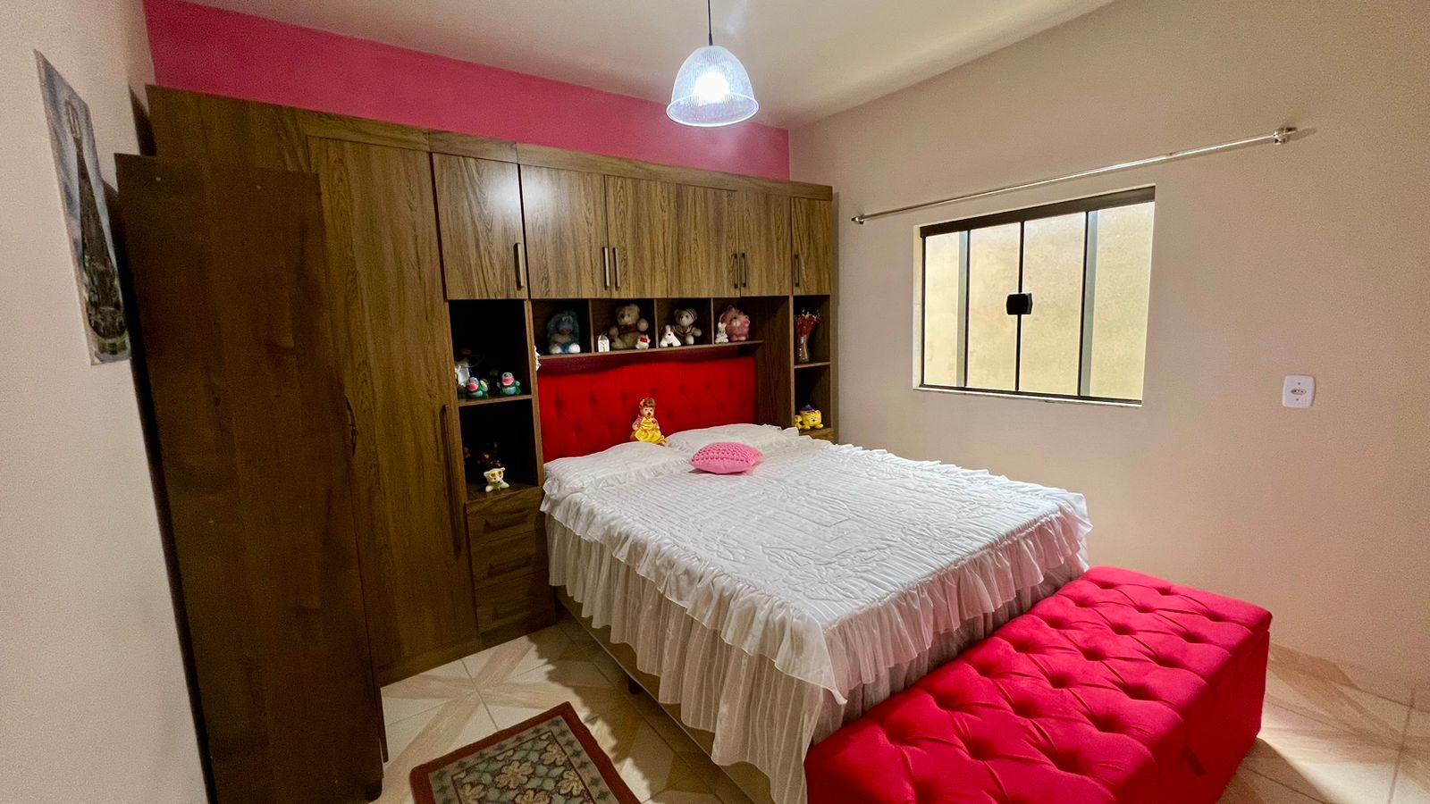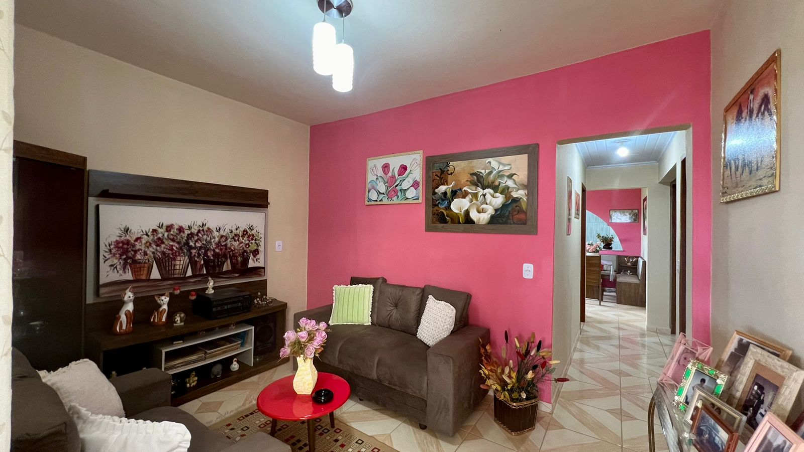 – 02 quartos, sala, sala de televisão, copa, cozinha conjugada com área de serviço, área externa e garagem para 03 carros;