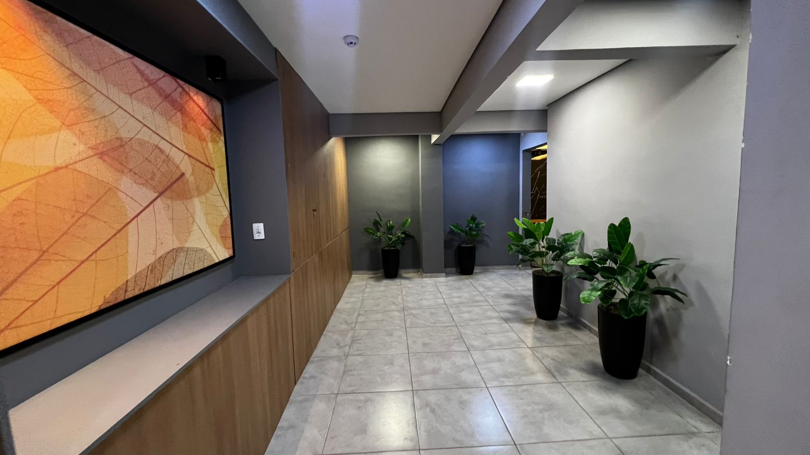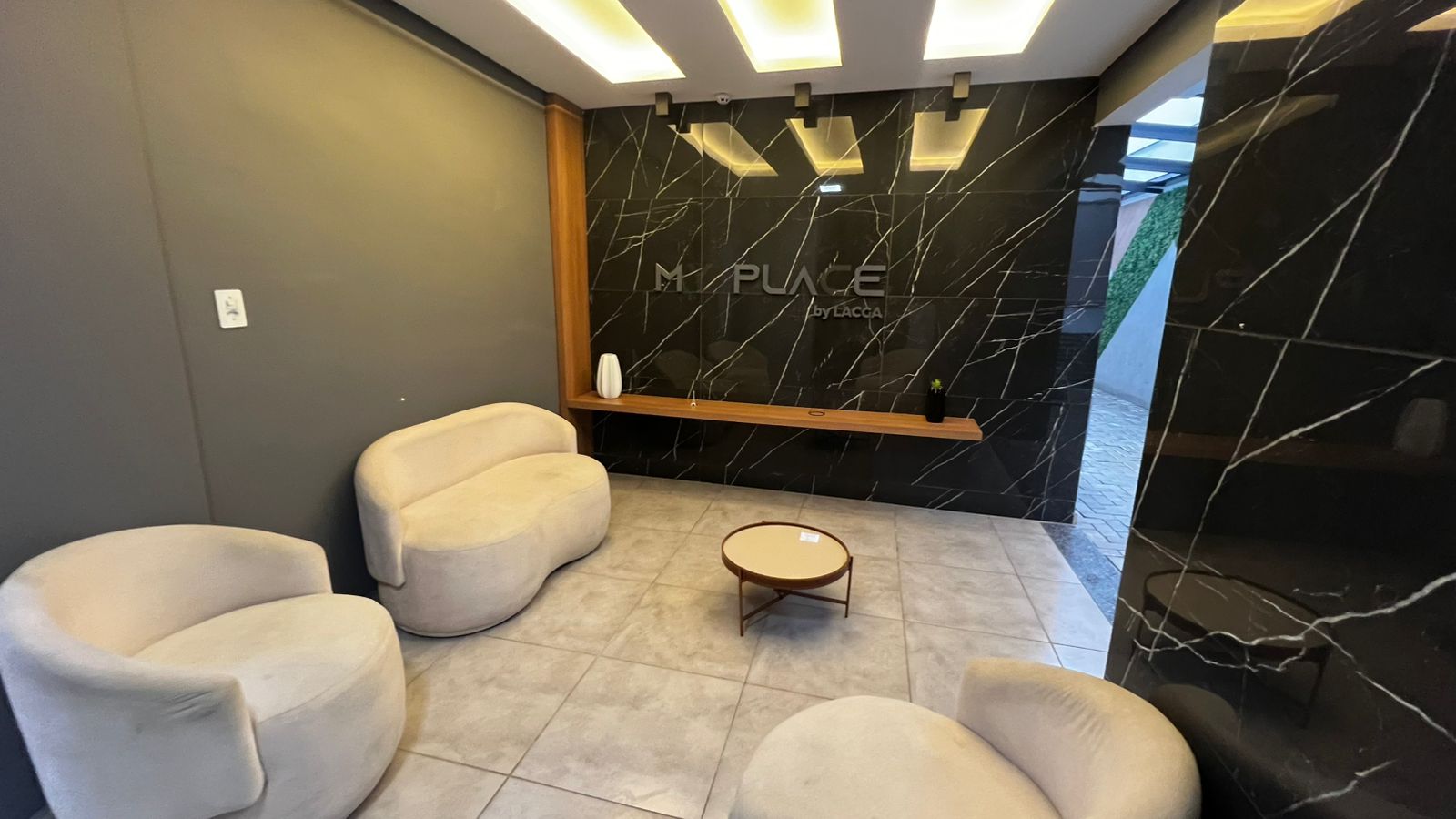 Studio planejado e mobiliado com banheiro, composto por academia, salão de festa e área com piscina.